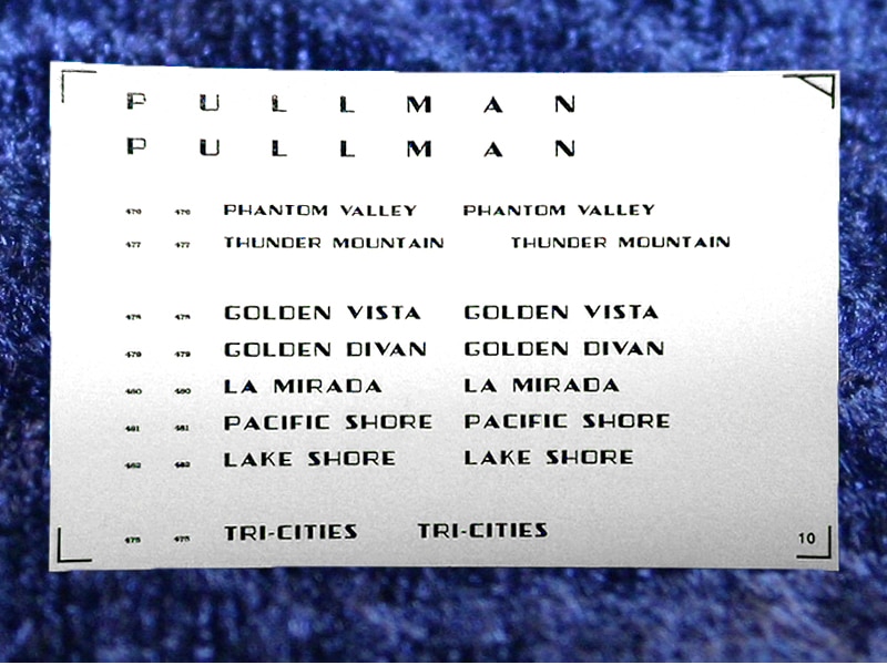 Black car names and numbers for streamlined, round end sleeper/lounge observations and parlor cars. All of the round end sleeper/lounge observations were converted to mid-train lounges in the 1950's.