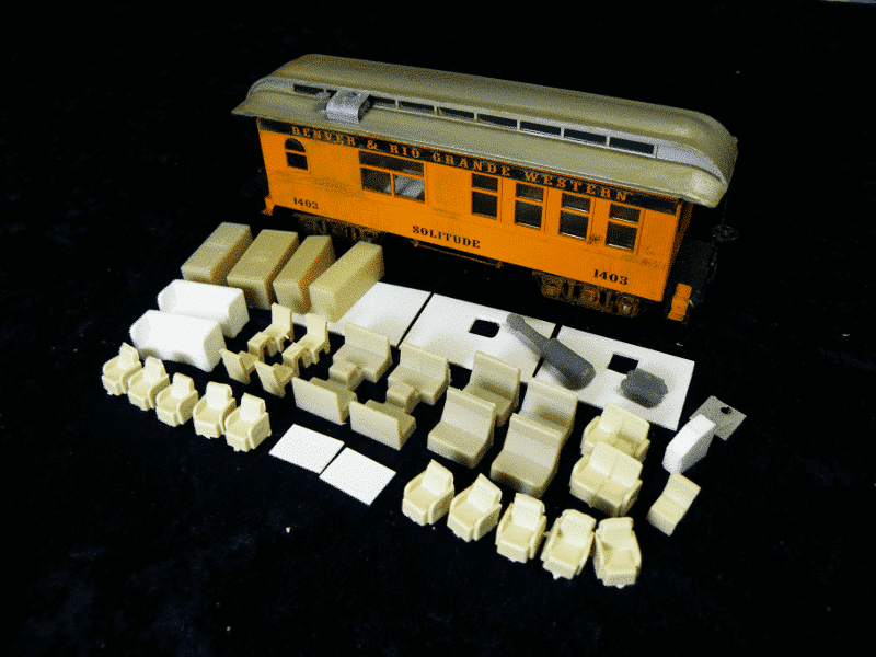 Contains lounge seats, car heater w/roof tanks, dining/cafe parts, lockers and refrigerator, and styrene strip with which to make partitions. (Kit does not include car pictured)