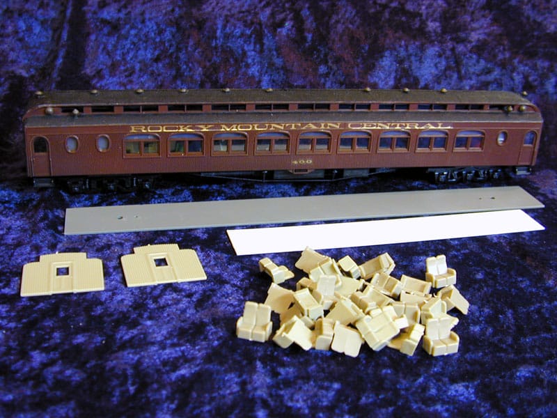 Contains coach seats, a metal floor/weight, vestibule bulkheads and styrene strip with which to make partitions. (Kit does not include car pictured)