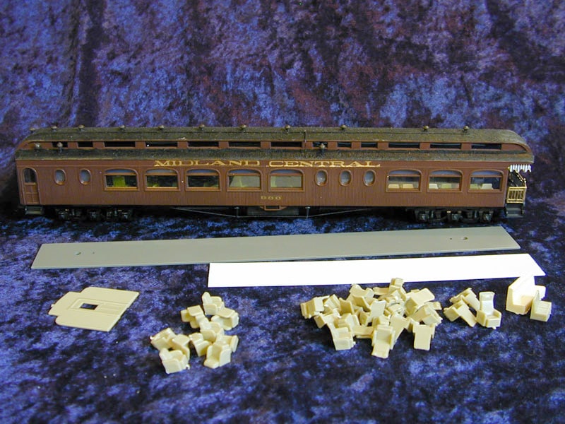 Contains parlor chairs, lounge seats, a metal floor/weight, vestibule bulkheads and styrene strip with which to make partitions. (Kit does not include car pictured)