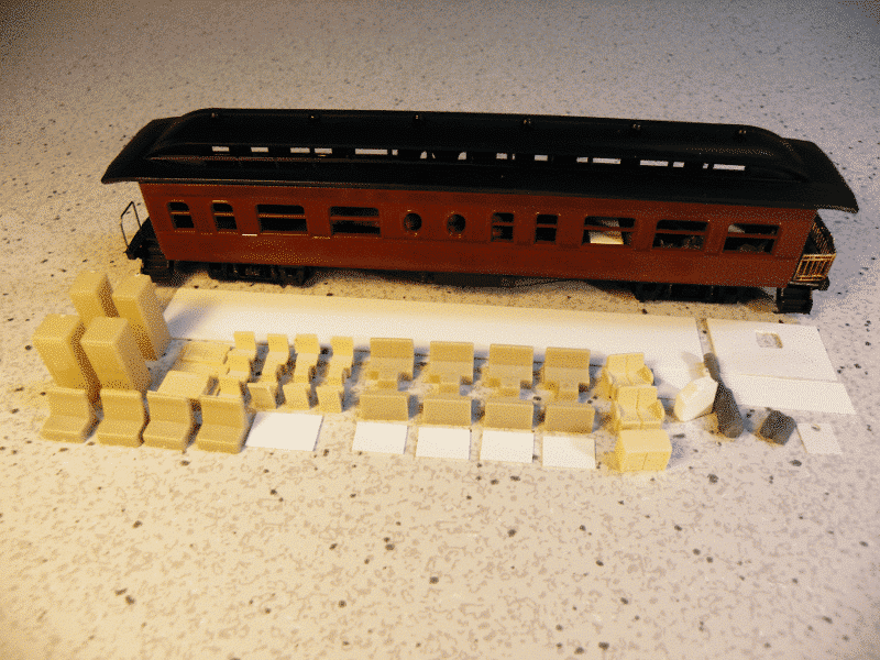 Contains seats, dining chairs and tables, lockers, refrigerators, car heater w/roof tanks and styrene strip with which to make partitions. (Kit does not include car pictured)