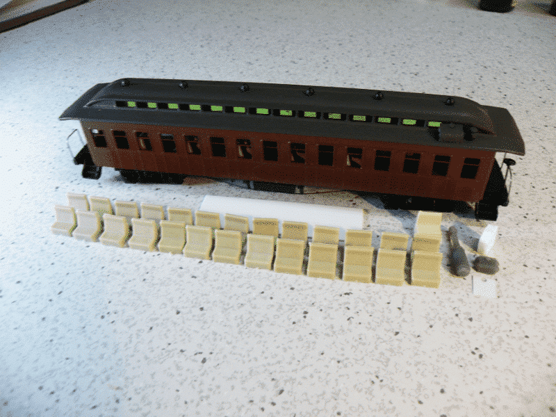 Contains coach seats, car heater w/roof tanks and styrene strip with which to make partitions. (Kit does not include car pictured)