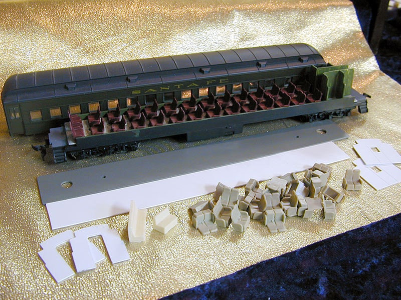 Contains coach seats, a metal floor/weight, vestibule bulkheads and styrene strip with which to make partitions. (Kit does not include car pictured below)