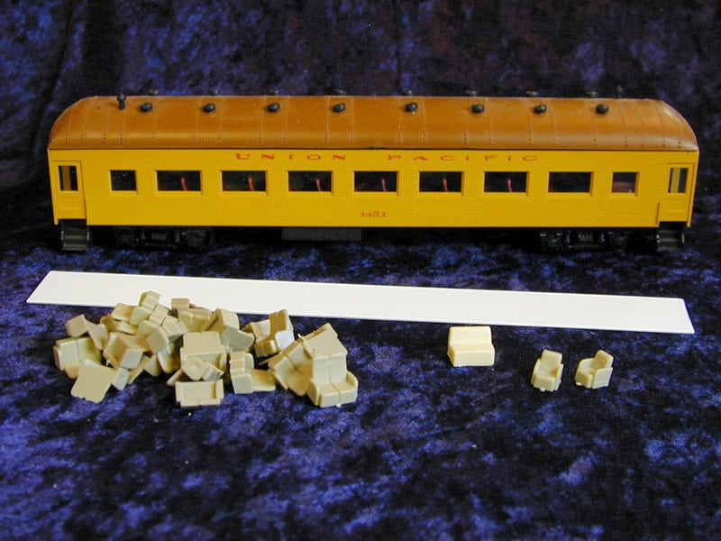 Contains coach seats and styrene strip with which to make partitions. (no floor/weight needed for these kits) (Kit does not include car pictured below)