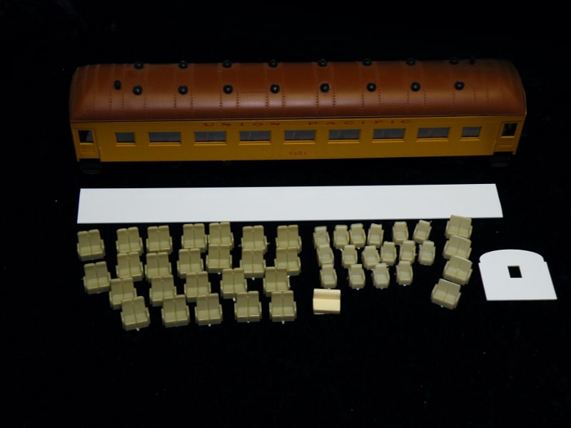 Contains enough seats for 48 coach passengers, lounge chairs, and styrene for interior walls.