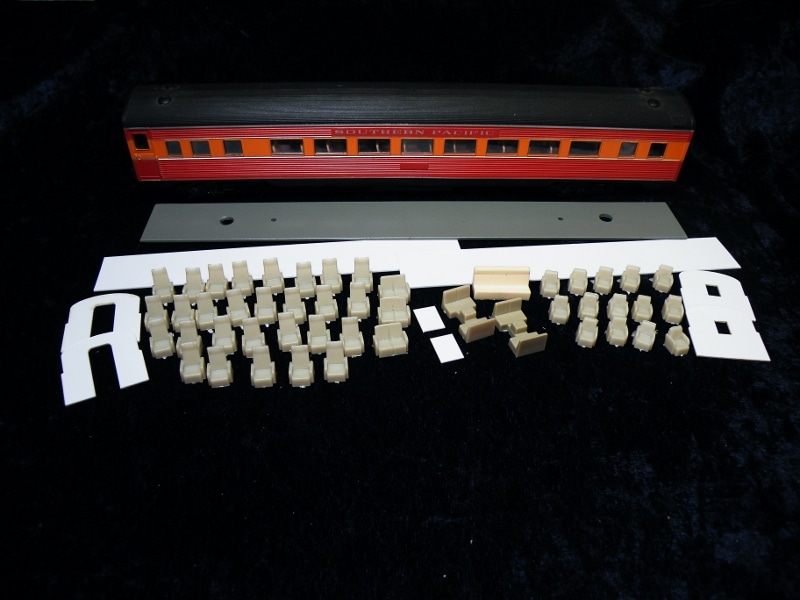 Contains parlor chairs, lounge chairs, a metal floor/weight, vestibule bulkheads and styrene strip with which to make partitions. (Kit does not include car pictured above)