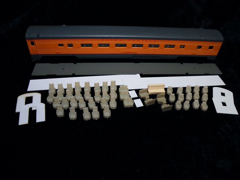 Contains parlor chairs, lounge chairs, a metal floor/weight, vestibule bulkheads and styrene strip with which to make partitions. (Kit does not include car pictured above)