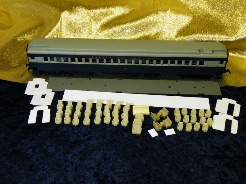 Contains parlor chairs, lounge chairs, a metal floor/weight, vestibule bulkheads and styrene strip with which to make partitions. (Kit does not include car pictured above)