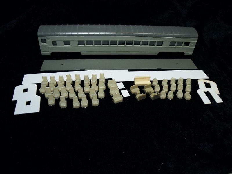 Contains enough seats for up to 28 Parlor passengers, lounge chairs, a metal floor/weight, vestibule bulkheads,and styrene for interior walls.