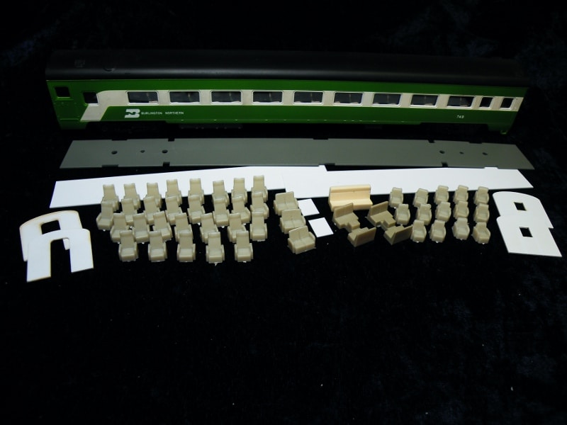 Contains parlor chairs, lounge chairs, a metal floor/weight, vestibule bulkheads and styrene strip with which to make partitions. (Kit does not include car pictured above)