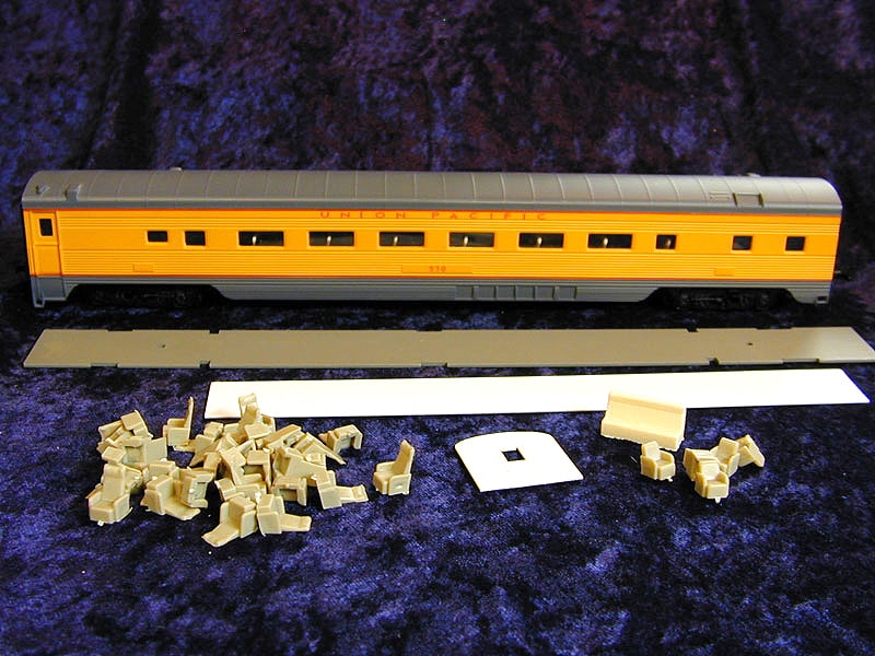 Contains parlor chairs, a metal floor/weight, vestibule bulkheads and styrene strip with which to make partitions. (Kit does not include car pictured below)