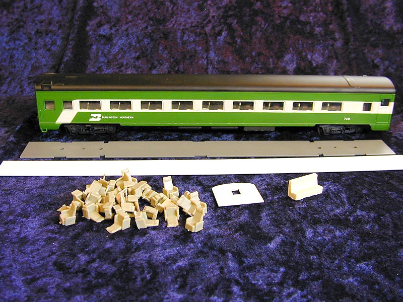 Contains parlor chairs, a metal floor/weight, vestibule bulkheads and styrene strip with which to make partitions. (Kit does not include car pictured below)