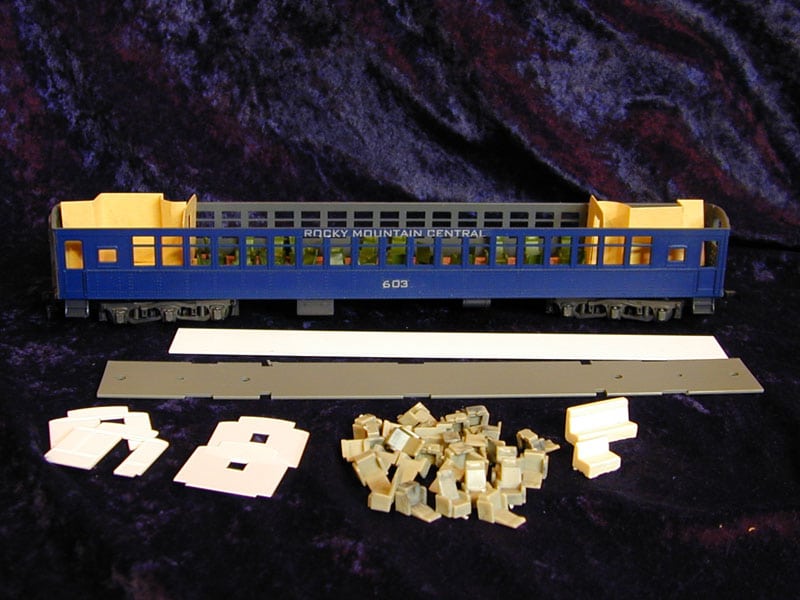 Contains parlor seats, a metal floor/weight, vestibule bulkheads and styrene strip with which to make partitions. (Kit does not include car pictured below)
