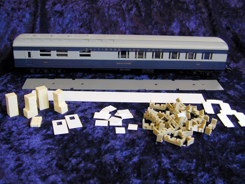 Contains dining chairs and tables for 48 passengers, metal floor/weight, ice boxes, lockers, buffet and styrene strip with which to make partitions.  (Kit does not include car pictured below)