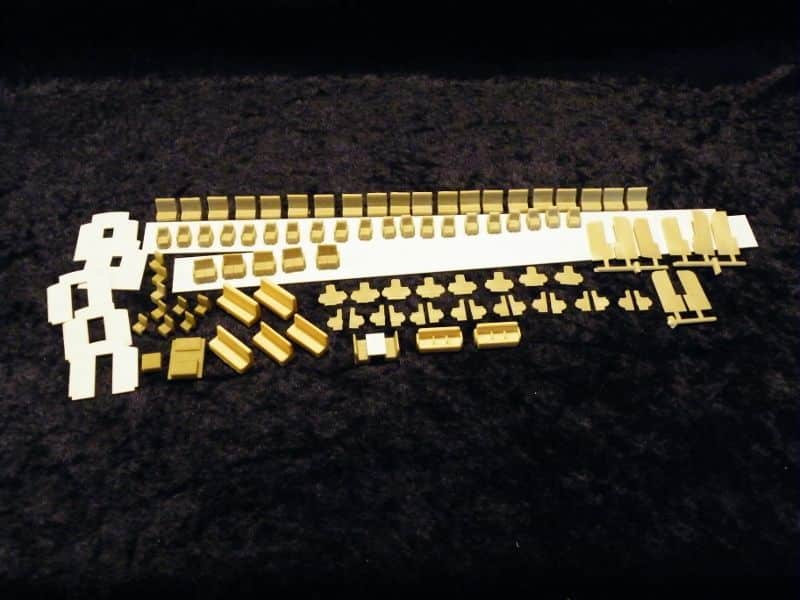 Contains berths, sofas, settees, lounge seats, section partitions, vestibule bulkheads and styrene strip with which to make partitions. (over 100 pcs) Floor material is NOT provided in this kit.  In brass cars we construct a styrene floor in segments to make it easier to install from the bottom of the car.
