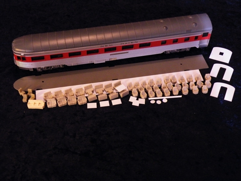Contains lounge chairs, settees, cafe booths, a metal floor/weight, vestibule bulkheads and styrene strip with which to make partitions. (Kit does not include car pictured above)