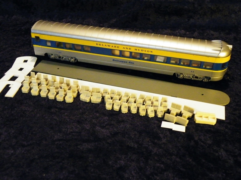 Contains parlor chairs, lounge chairs, a metal floor/weight, vestibule bulkheads and styrene strip with which to make partitions. (Kit does not include car pictured above)
