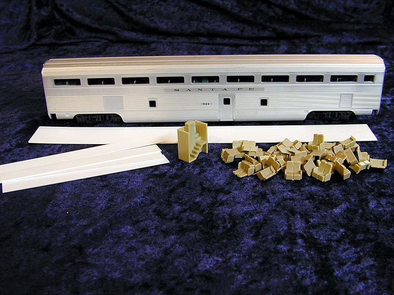 Contains upper floor, coach seats, center stairs, and styrene strip with which to make supports for upper floor.(Kit does not include car pictured)