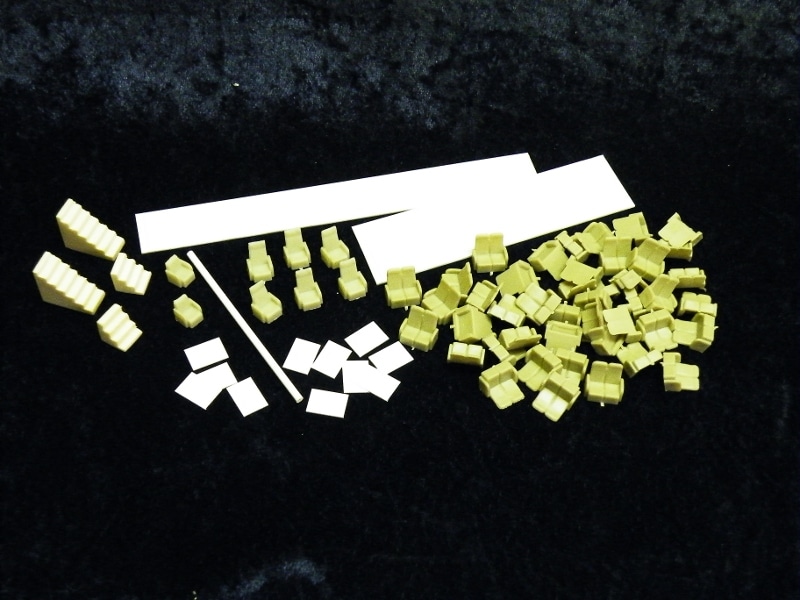 Contains: coach seats, cab seats, stairs, tables, and styrene strips with which to make partitions.