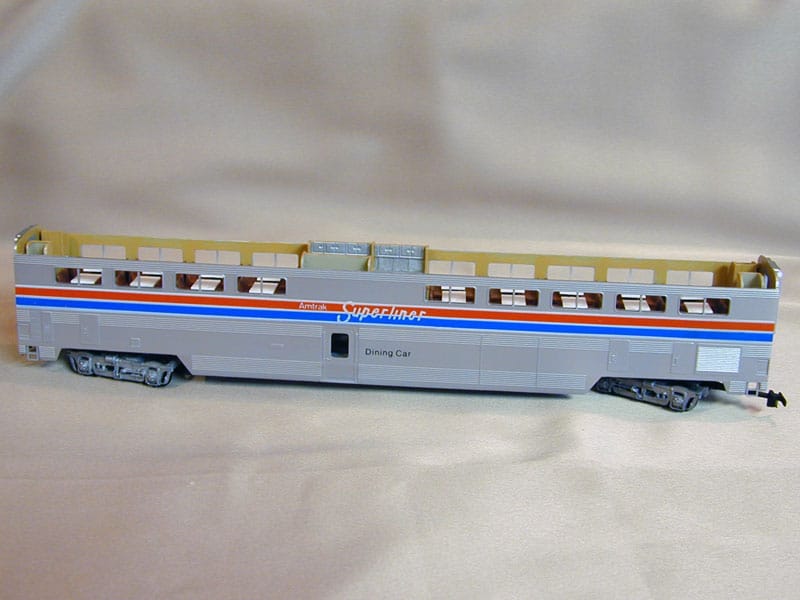 Contains cafe booths and tables for 72 passengers, an upper level floor, stairway, serving counters, and lockers.  (Kit does not include car pictured below)