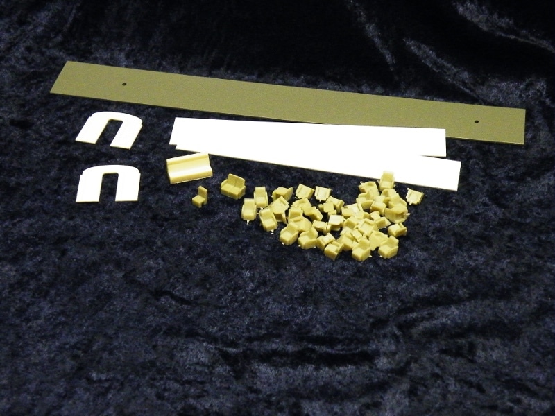 For cars with lounge style parlor chairs. Contains enough seats for up to 38 passengers plus a drawing room. Contains a floor weight, compartment bulkheads and a styrene strip with which to make partitions.