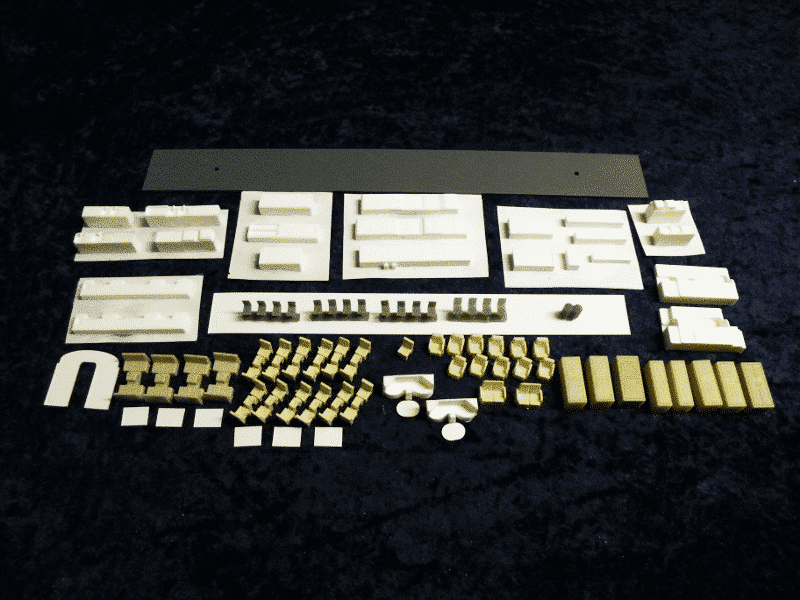 Contains enough kitchen and serving counter pieces, dining chairs, a floor weight, bulkheads, ice boxes, lockers, buffet and styrene strip with which to make partitions.